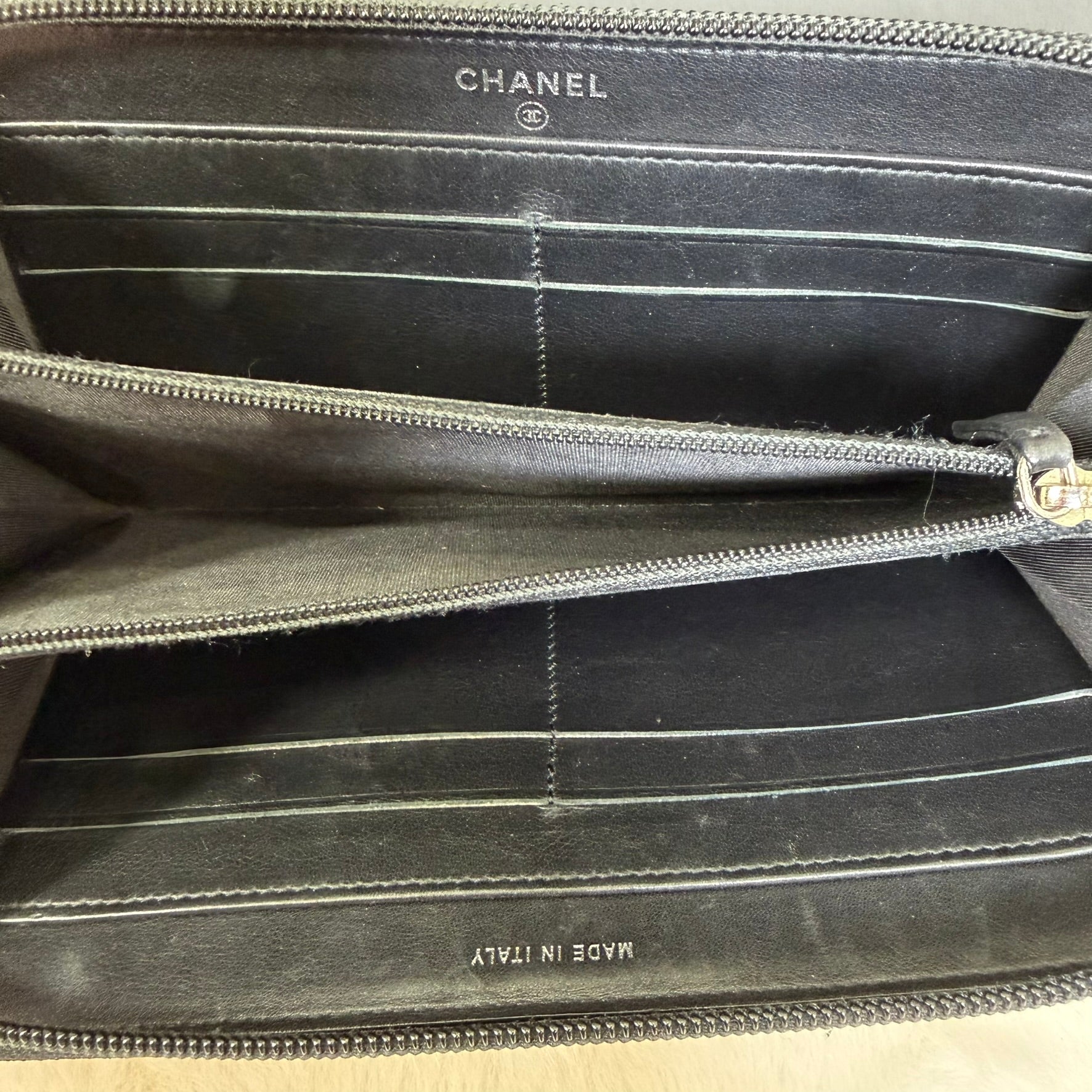 Elevate your essentials with the Chanel Black Chevron Lambskin Boy Wallet. Crafted from luxurious lambskin leather, its chevron pattern adds timeless elegance while the compact design ensures effortless organization. This wallet combines refined style and practical functionality, making it an indispensable accessory for those who appreciate both sophistication and convenience.