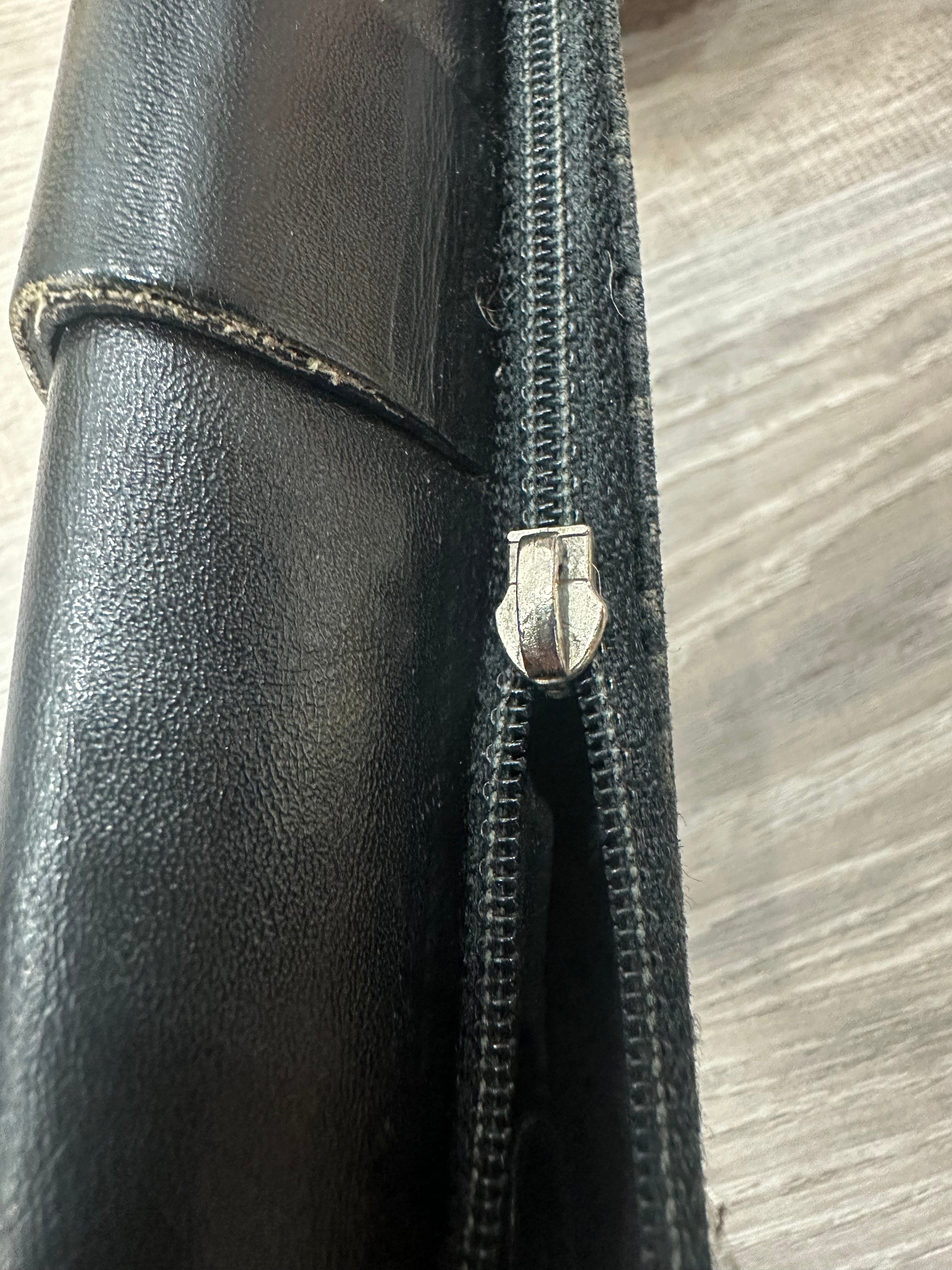 Chic Dior wallet in black and gray with a minor callout, missing back zipper pull. Features signature logo pattern and metal accent.