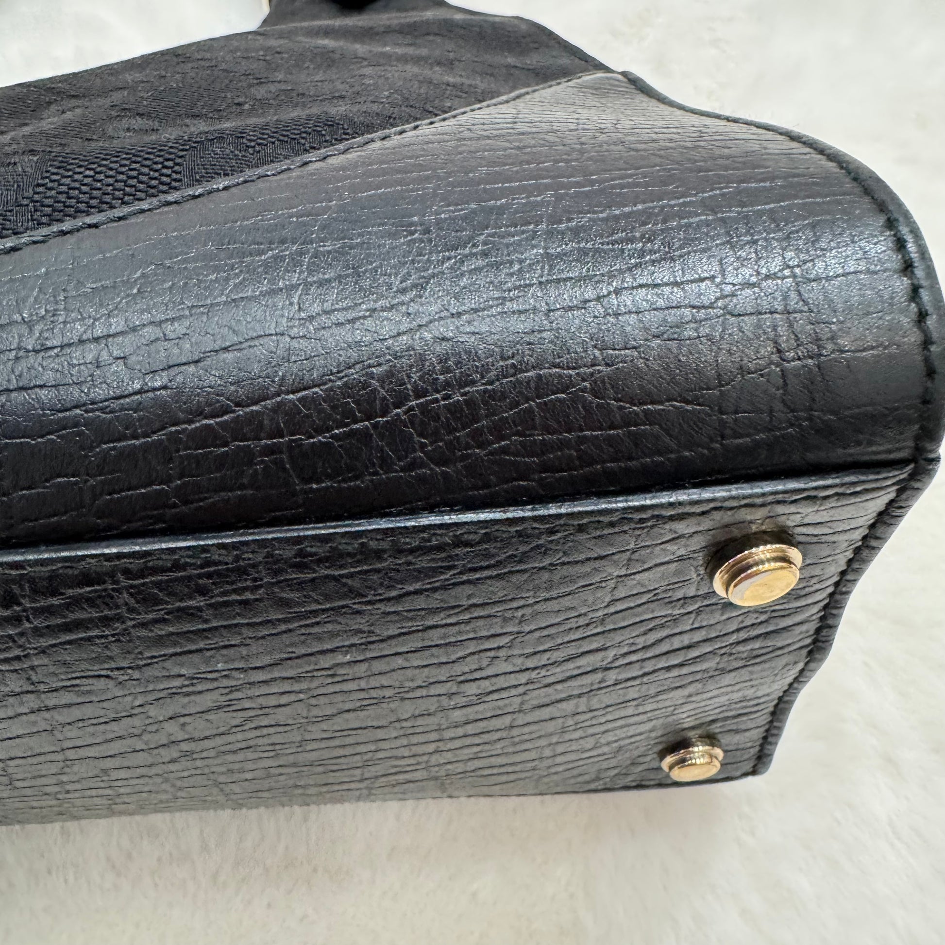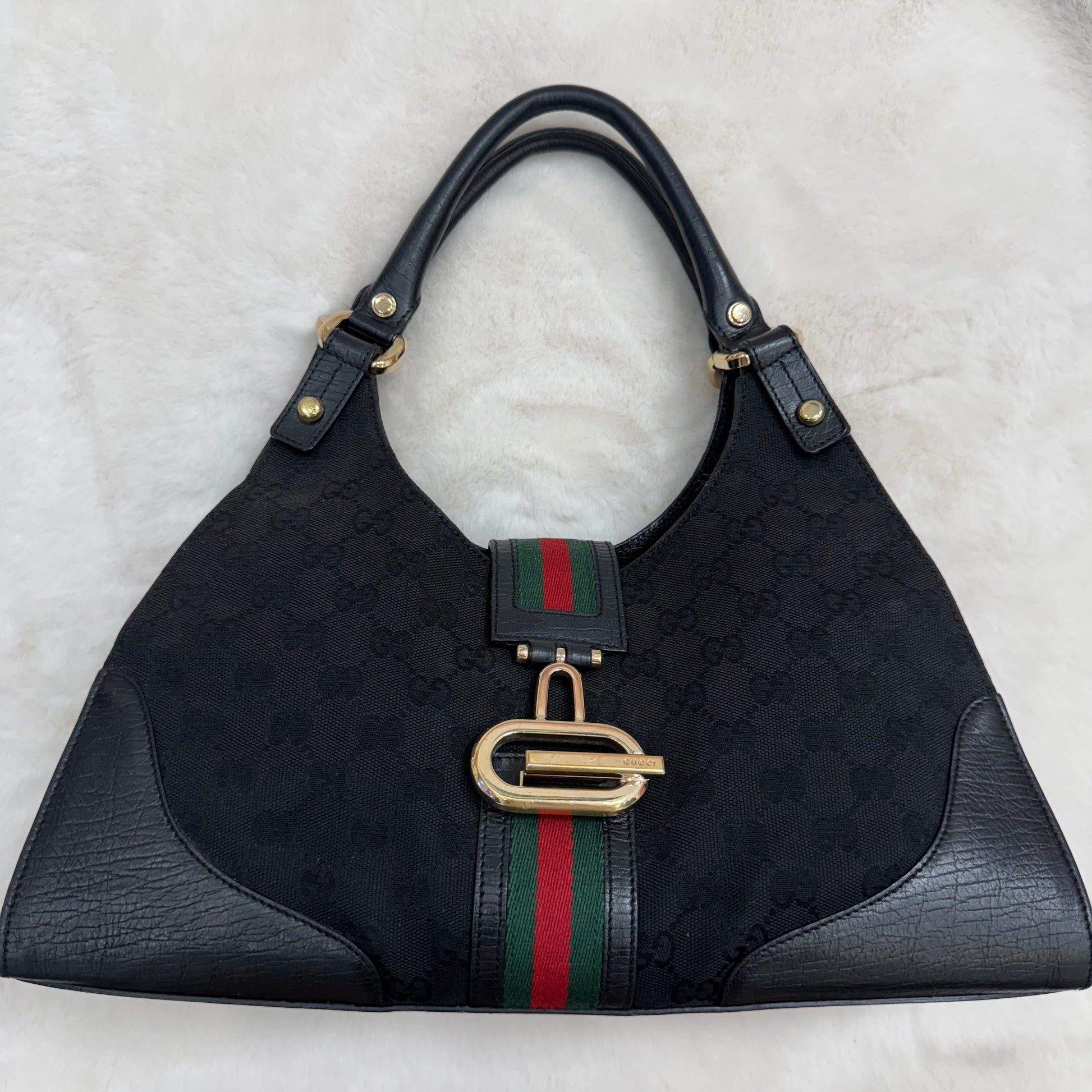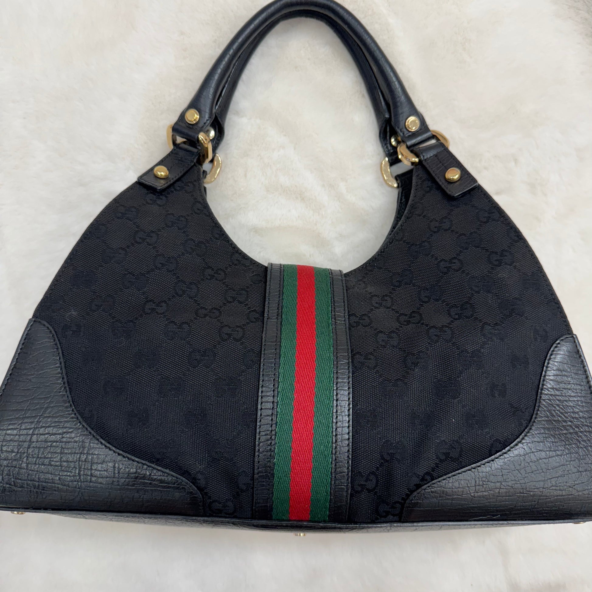 The Gucci Black Monogram Junco Shoulder Bag, enhanced with the iconic Sherry line, embodies timeless sophistication. Featuring distinctive brass interlocking GG hardware, this bag combines secure functionality with elegant design. Its sleek black finish and refined details make it a versatile choice for those seeking understated luxury and effortless style.